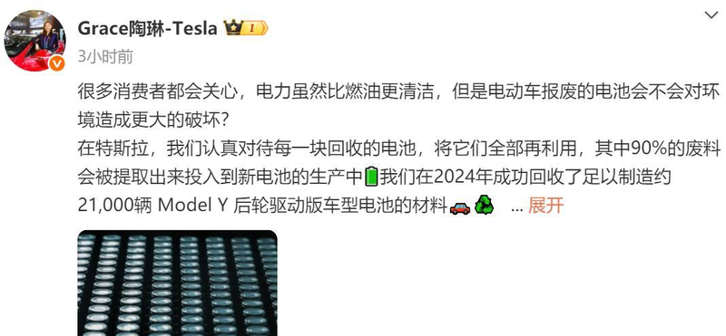 8月11日消息,特斯拉公司副总裁陶琳在社交平台发文称,特斯拉特斯拉认真对待每一块回收的电池,将它们全部再利用,其中 90% 的废料会被提取出来投入到新电池的生产中。