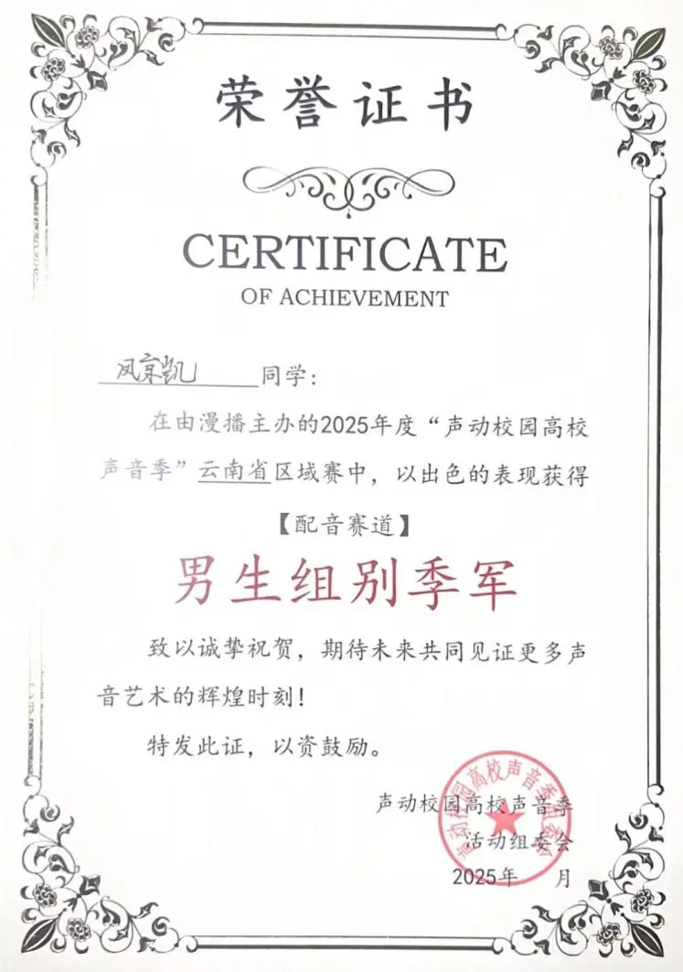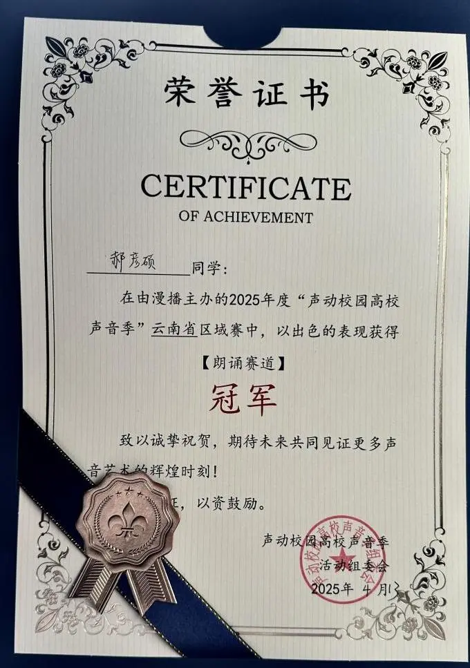 云南艺术学院戏剧学院播音系23级学生郝彦硕的原创朗诵作品《长安行》荣获云南省赛区朗诵赛道比赛冠军。云南艺术学院戏剧学院播音系22级学生凤京凯在本次大赛配音赛道中获得男生组季军。