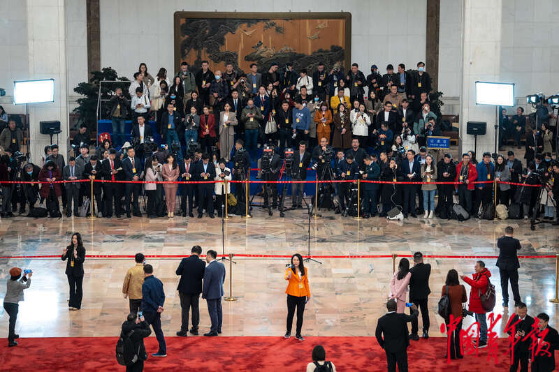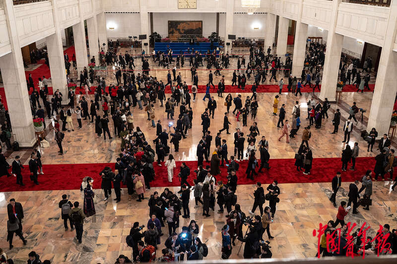 3月5日,人民大会堂,十四届全国人大二次会议开幕会开始前,即将进行首场“代表通道”集中采访活动,记者们已经在现场做好准备。中青报·中青网记者 李隽辉/摄