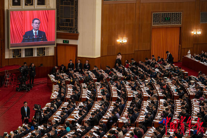 3月5日,北京,人民大会堂,十四届全国人大二次会议开幕会上,大会听取国务院总理李强关于政府工作的报告。当日上午9时,十四届全国人大二次会议在北京人民大会堂开幕。中青报·中青网记者 李隽辉/摄