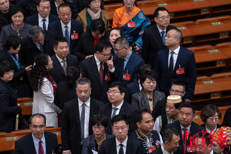 3月5日,人民大会堂,十四届全国人大二次会议第一次全体会议结束后,离场的代表们与正在采访的记者。中青报·中青网记者 李隽辉