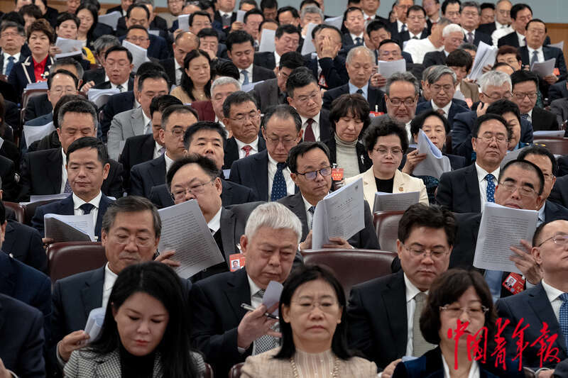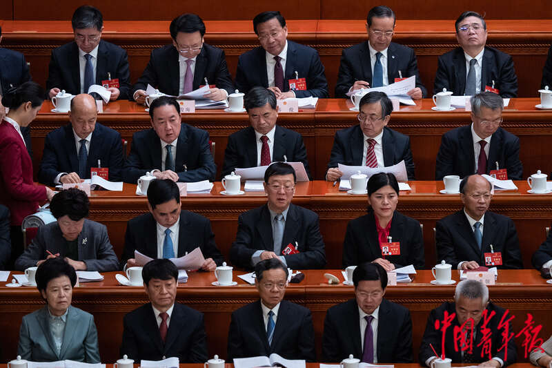 3月5日,北京,人民大会堂,十四届全国人大二次会议第一次全体会议,主席台上的代表们。中青报·中青网记者 李隽辉/摄