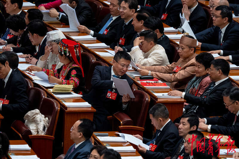 3月5日,北京,人民大会堂,十四届全国人大二次会议第一次全体会议,代表们在会议开始前相互交流。中青报·中青网记者 李隽辉/摄