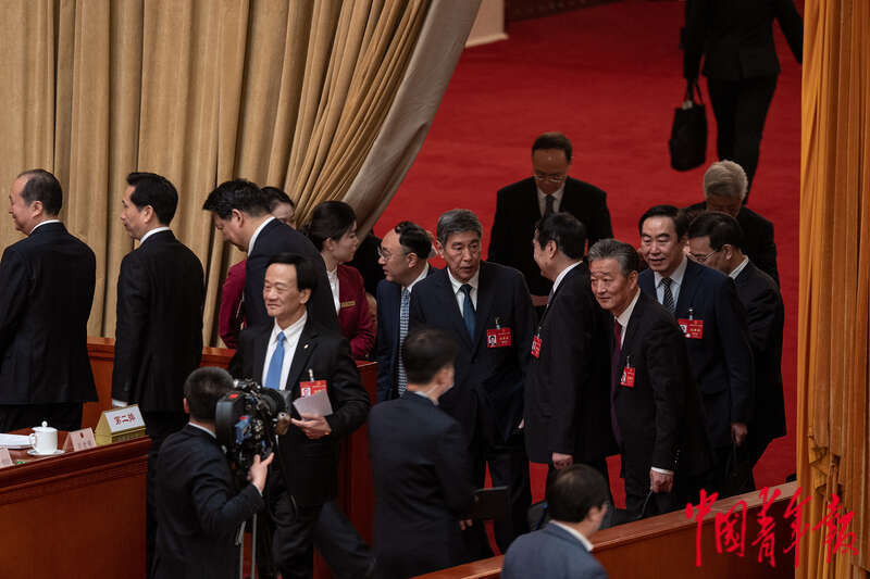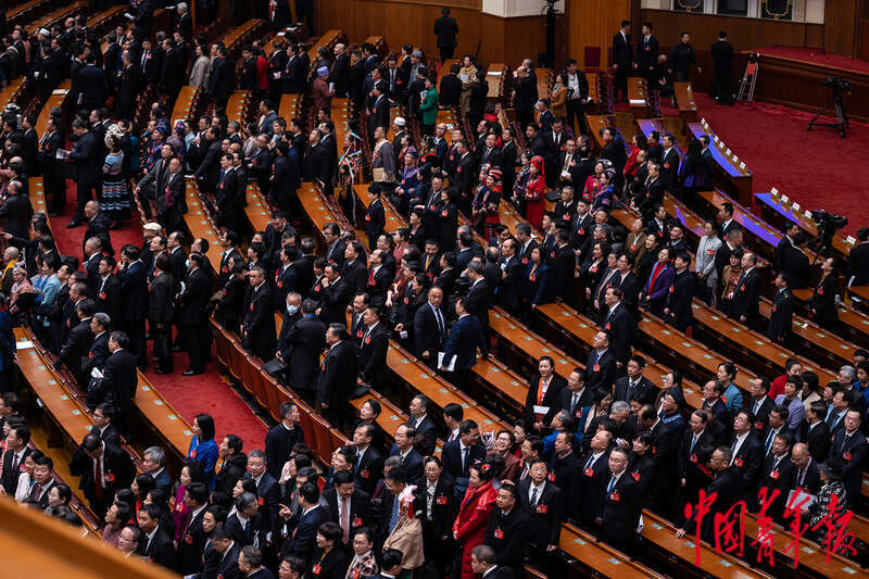 3月5日,北京,人民大会堂,十四届全国人大二次会议第一次全体会议结束后,代表们有序离场。中青报·中青网记者 李隽辉/摄