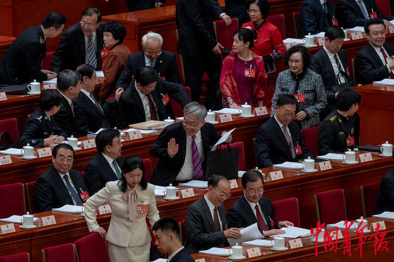 3月5日,北京,人民大会堂,十四届全国人大二次会议第一次全体会议结束后,代表们在离场时相互交流。中青报·中青网记者 李隽辉/摄