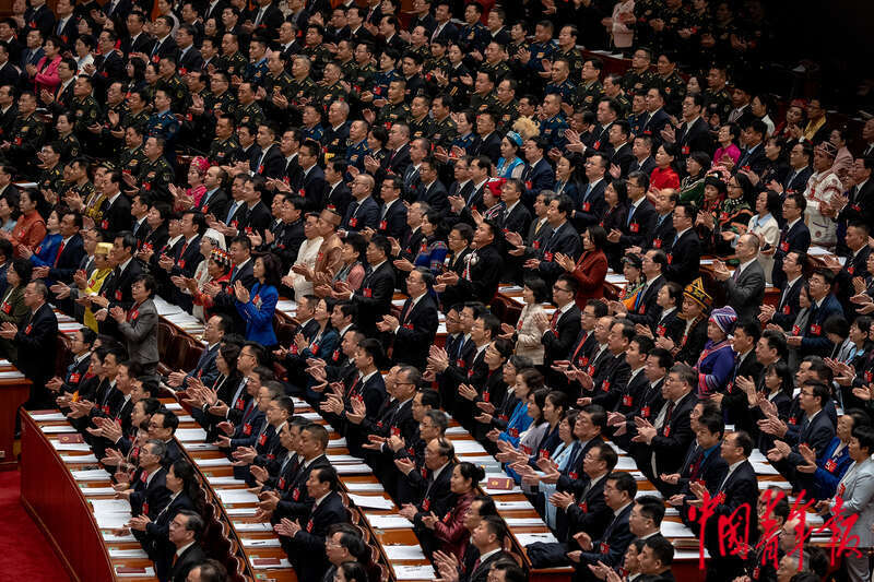3月5日,北京,人民大会堂,十四届全国人大二次会议第一次全体会议,代表们起立鼓掌。中青报·中青网记者 李隽辉/摄